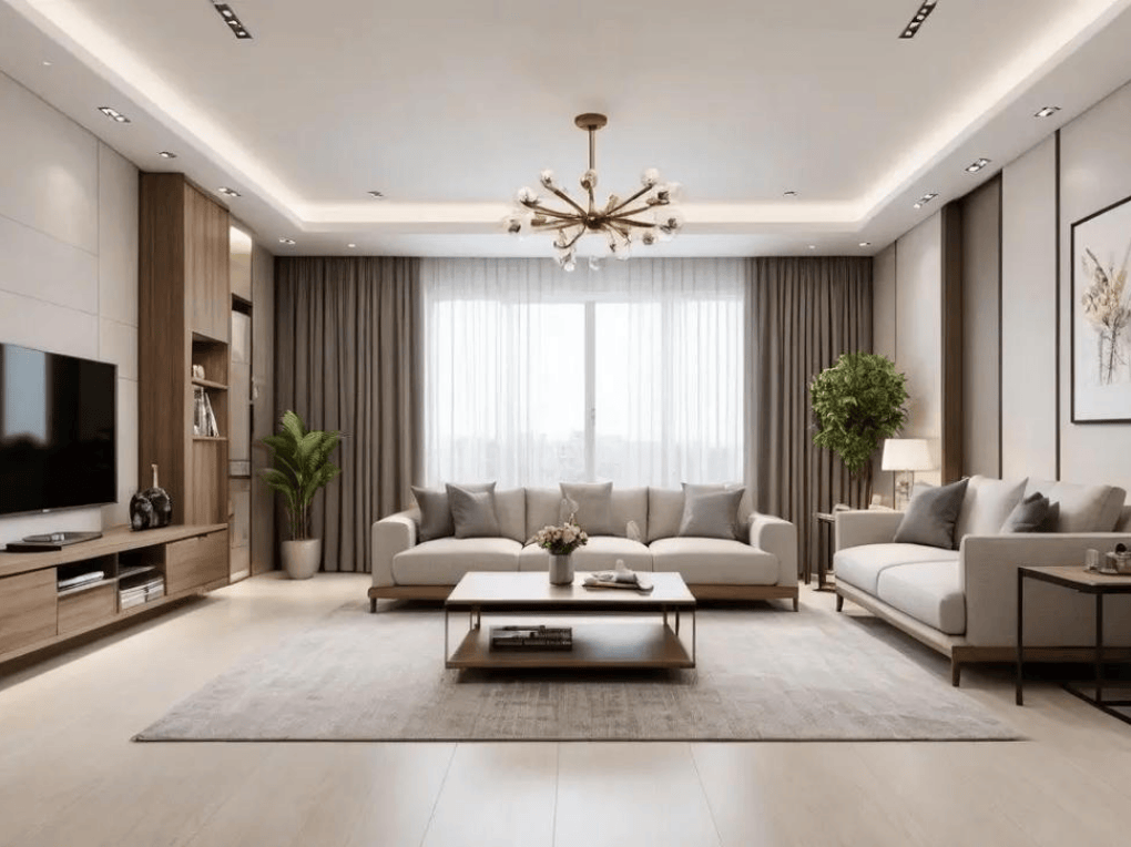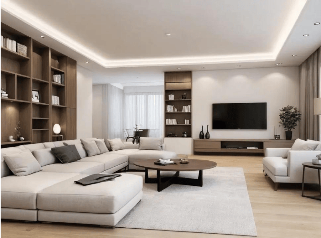 空间款式起承转合,美轮美奂,两侧原木壁龛摆满艺术品,轮廓流利天然,别具一格。结构合理有序。成为很多家庭拆修的首选。